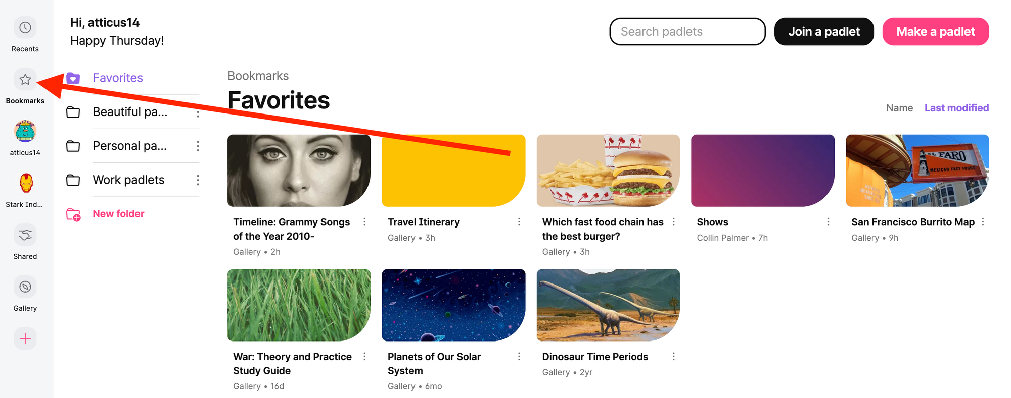 The Bookmarks tab will help you manage and organize all the padlets you want to keep track of.