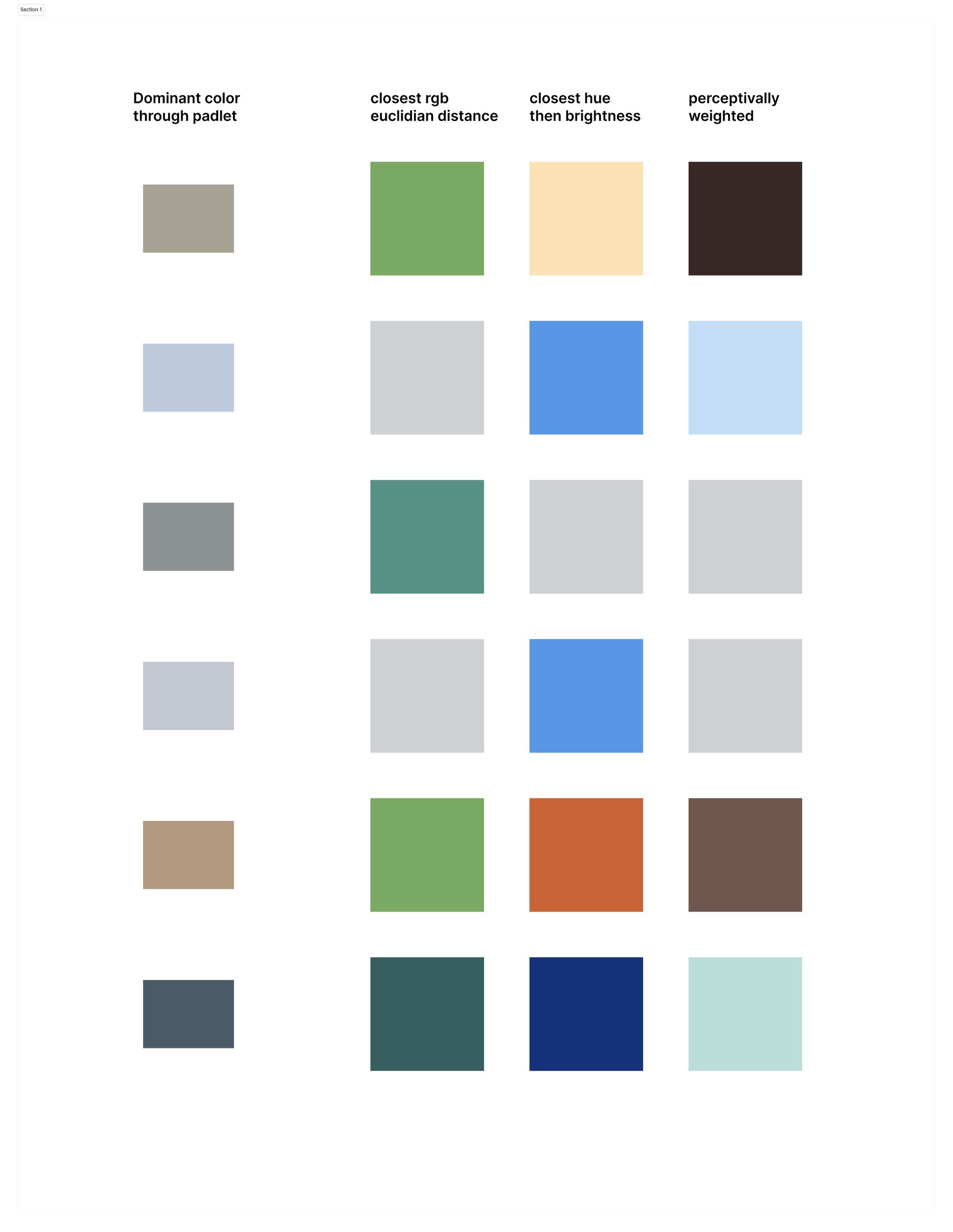 Upon testing, we quickly realized that this problem was much more daunting than anticipated. RGB, HSV, and HSL have non-linear dimensions meaning that the distances between two colors could be numerically small but perceptively huge when it comes to 'seeing' the colors. To account for this, I experimented with adding weights to each dimension in RGB and HSL and although the results looked better than using raw L2 distance, the root problem remained - the dimensions are non-linear.