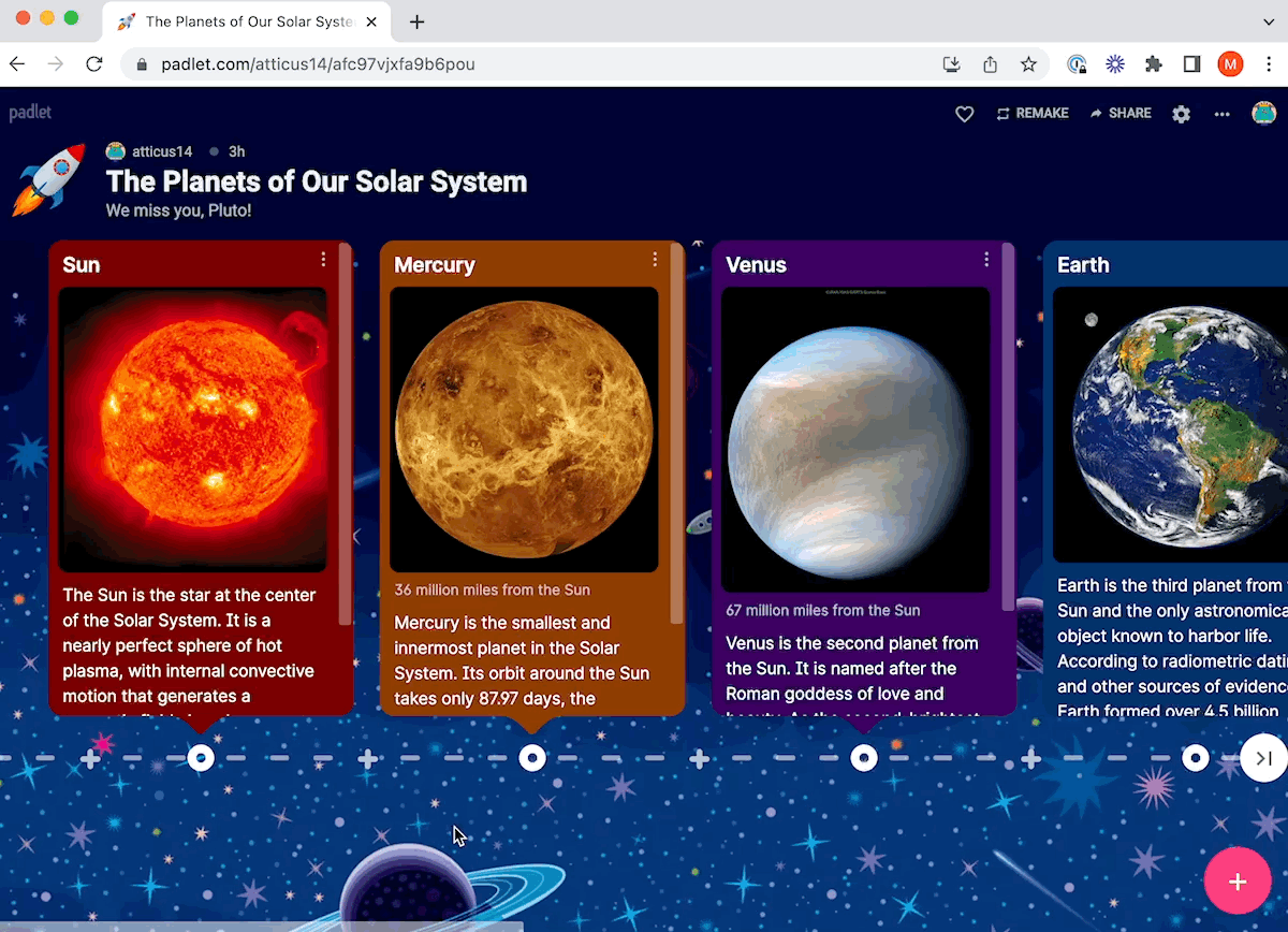 The new design also allows you to build presentations with Padlet with the help of the post navigation. If you build your padlet in order, with each new post as a new slide in your presentation, you can start from the beginning and click through them. Check out our padlet presentation of the planets here.