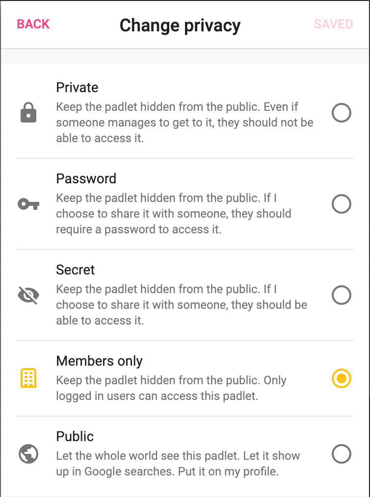Like our Secret privacy setting, you just need to share the link to your Members only padlet with your collaborators. However, unlike the Secret setting, collaborators must log in before accessing or posting on the padlet.