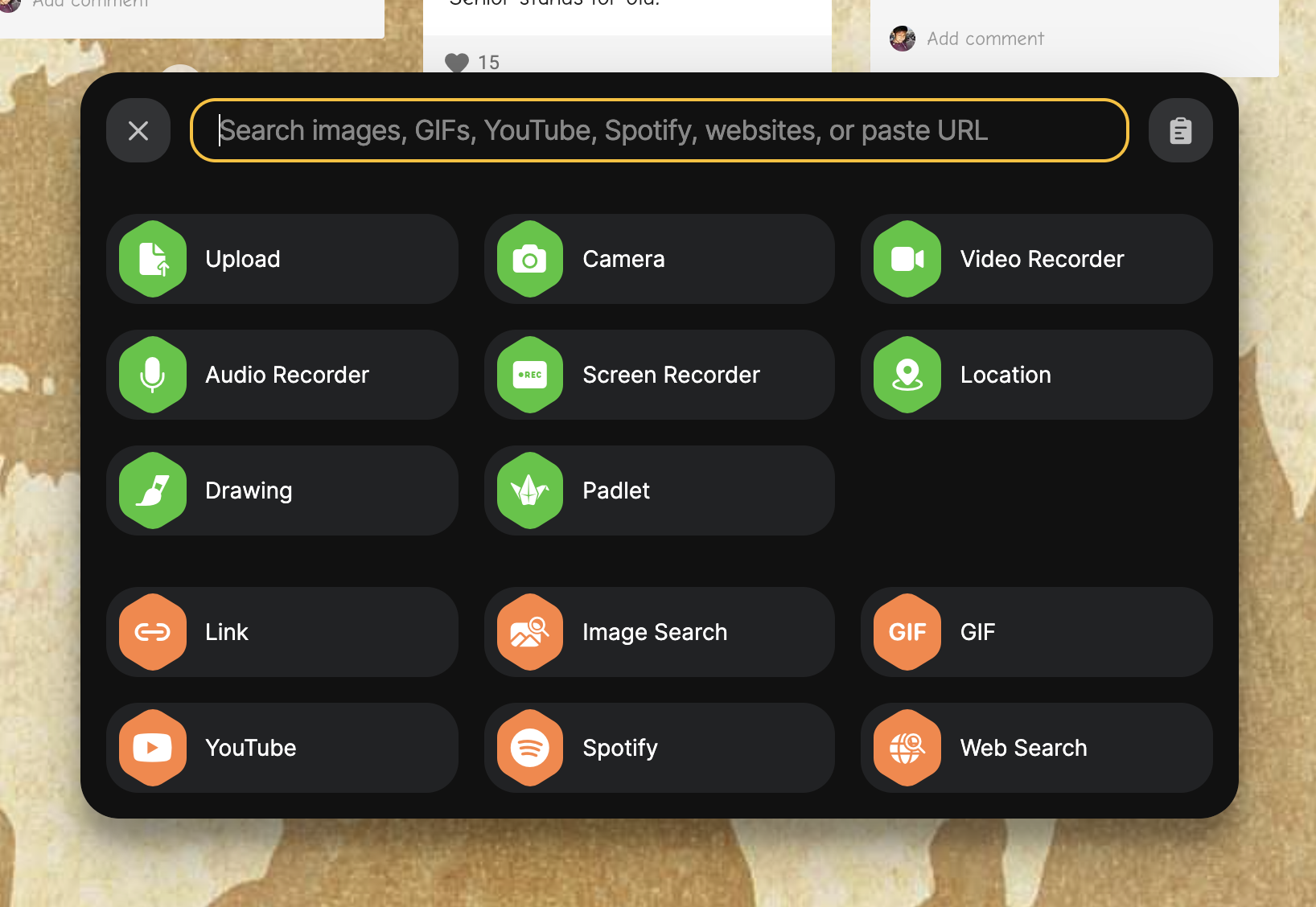 Beyond these search improvements, we are beginning to support dark mode, starting here with the attachment picker. Be on the lookout for more dark mode in different parts of Padlet in the weeks and months to come.