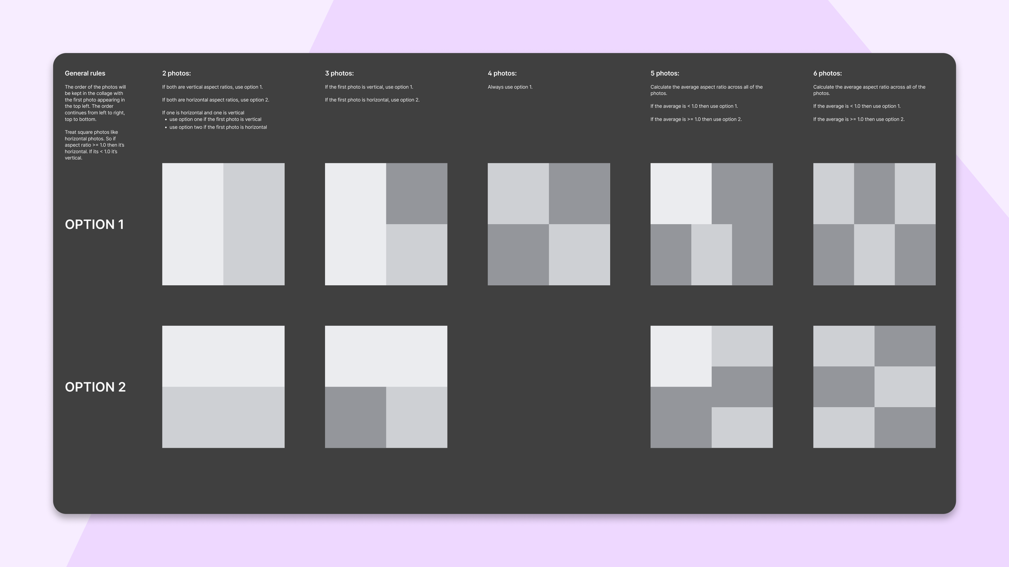 Early on, we explored two approaches: collages (all photos visible at once in a grid) and carousels (swipe through them like slides).